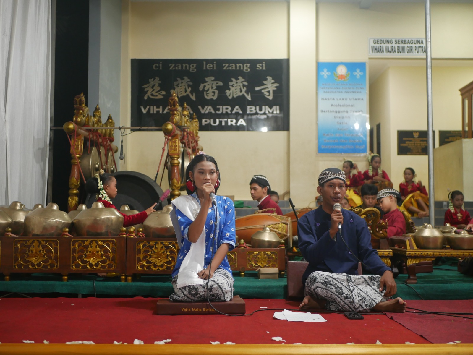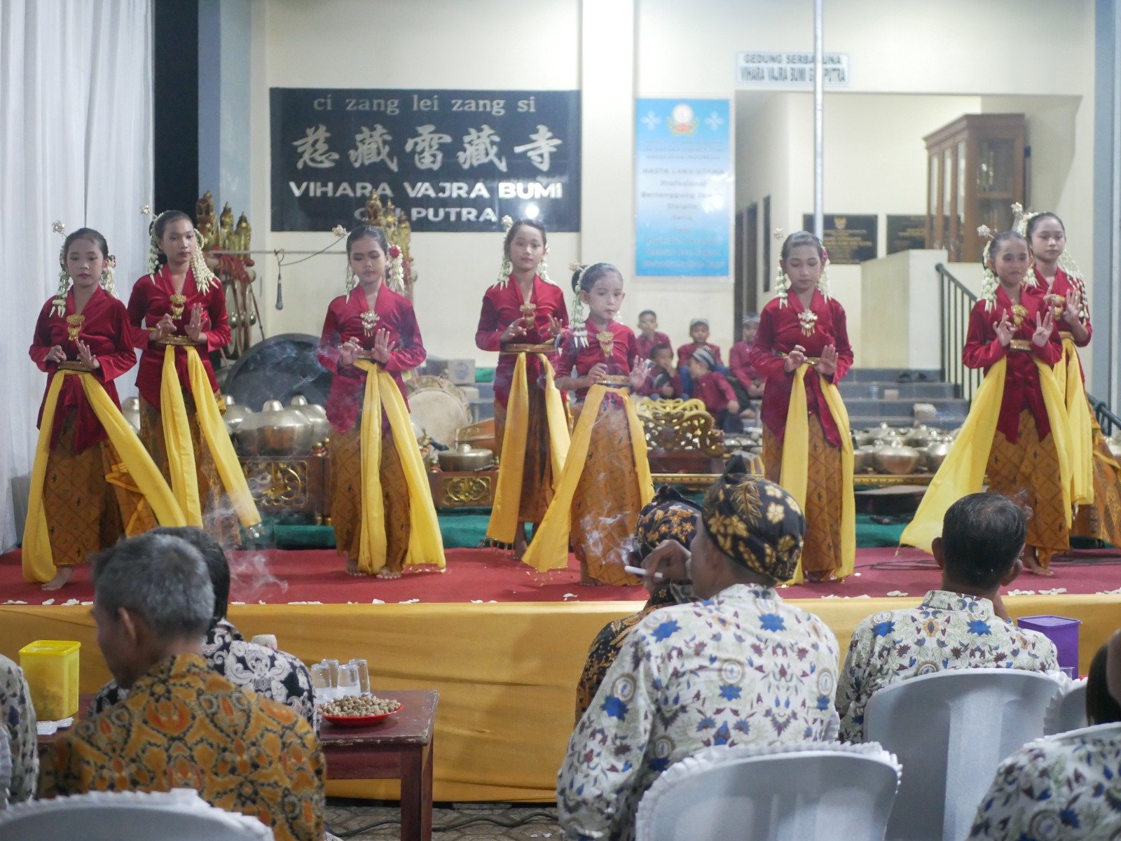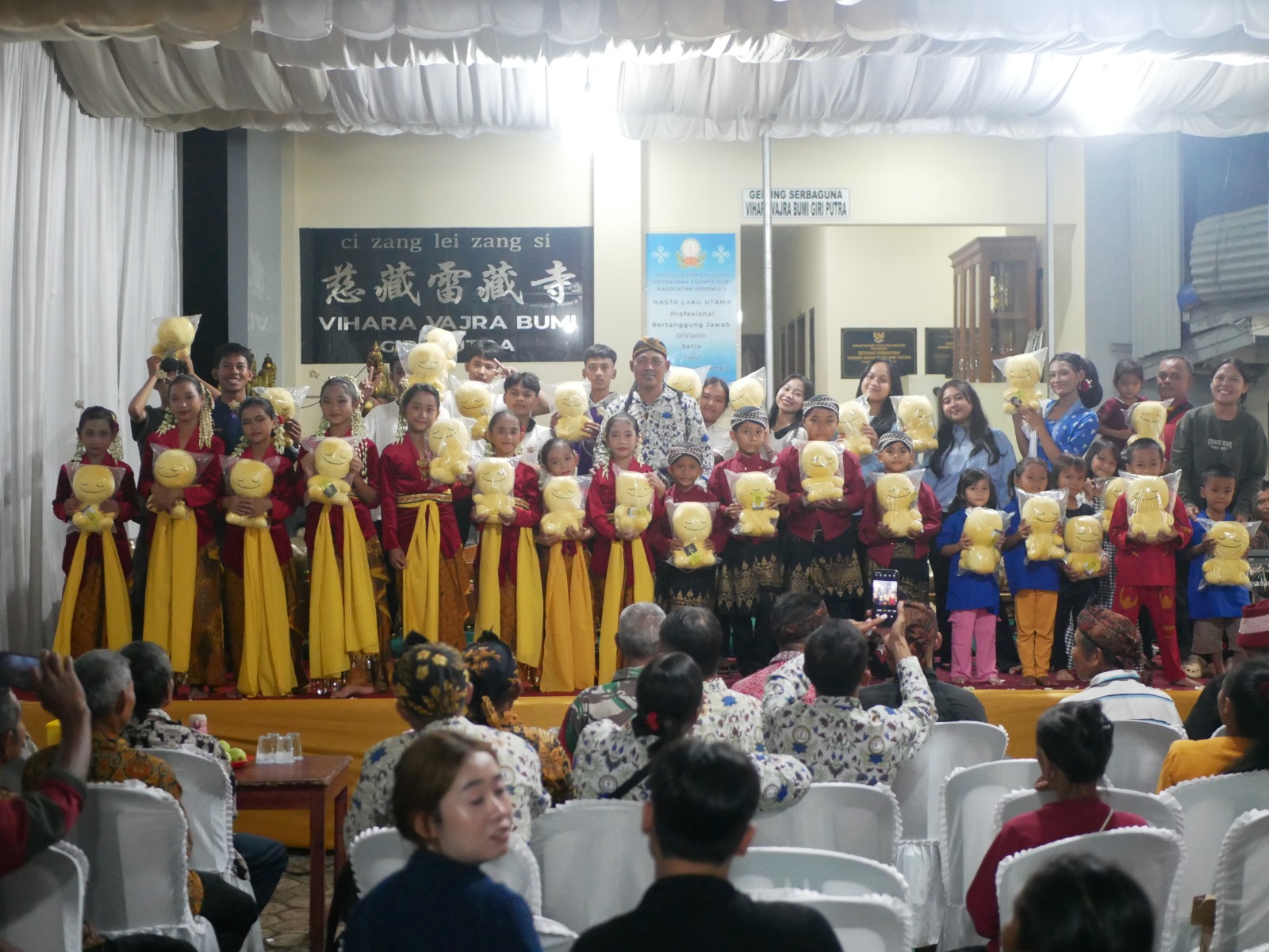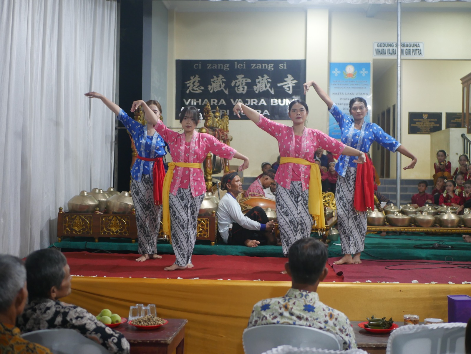 Usai rangkaian perapalan mantra, kegiatan dilanjutkan dengan kebersamaan menyambut Tahun Baru 2026 di halaman vihara. Acara diisi dengan pentas seni karawitan, tari tradisional, serta gerak lagu yang ditampilkan generasi muda Vihara Vajra Bumi Giri Putra dari tingkat SD hingga mahasiswa. Pada kesempatan tersebut, Pandita Dharmaduta Tasimun menyampaikan pembabaran Dharma tentang pentingnya menumbuhkan kebajikan secara berkesinambungan dan melatih kemurahan hati dalam kehidupan sehari-hari. Kemeriahan acara semakin terasa dengan pembagian door prize berupa alat pertanian dan hadiah lain yang sesuai kebutuhan warga, sehingga perayaan Tahun Baru berlangsung hangat, bermakna, dan penuh sukacita.