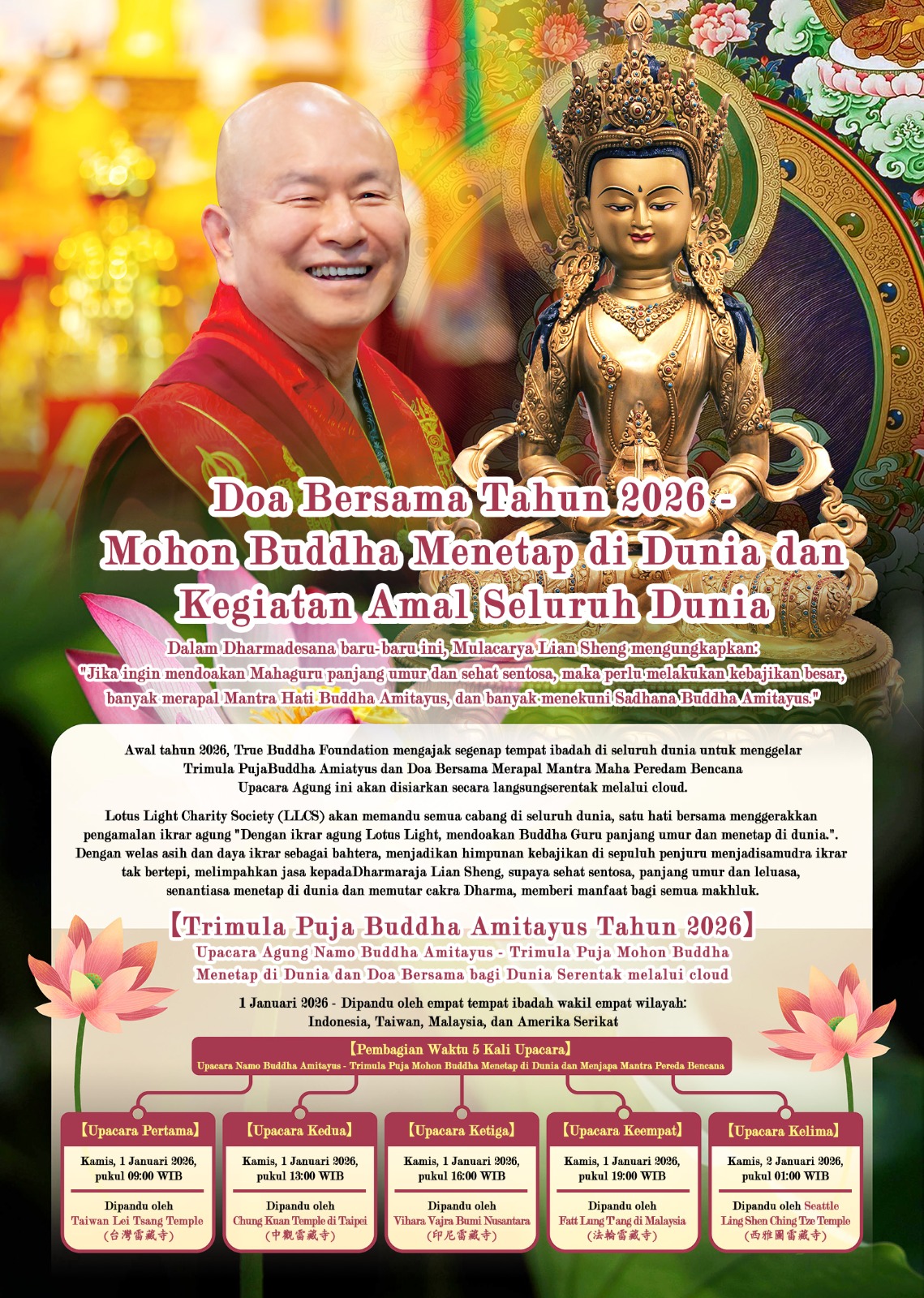 Awal tahun 2026, True Buddha Foundation mengajak segenap tempat ibadah di seluruh dunia untuk menggelar Trimula Puja Buddha Amiatyus dan Doa Bersama Merapal Mantra Maha Peredam Bencana