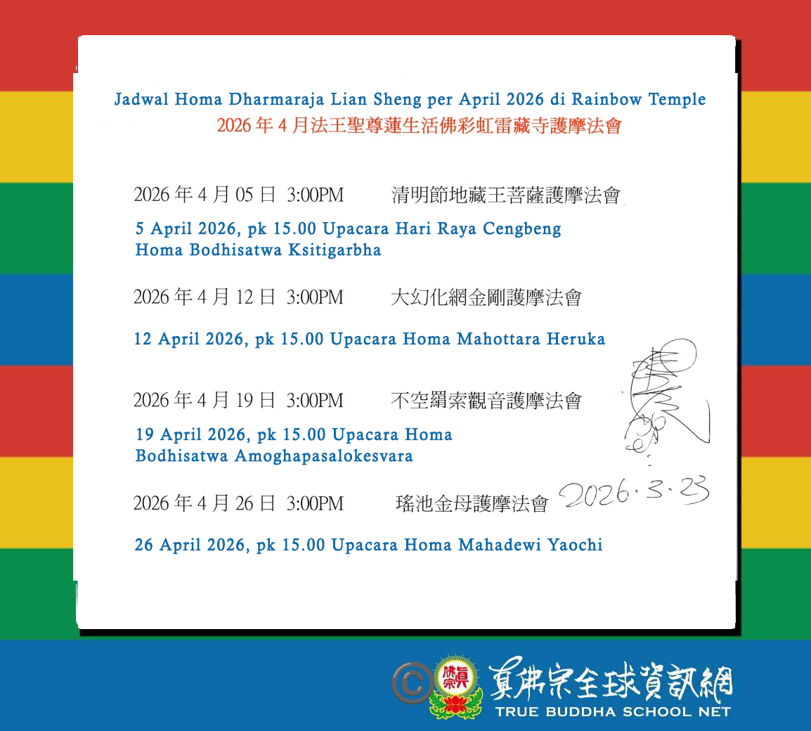 Jadwal Homa Dharmaraja Lian Sheng Bulan April 2026 di Rainbow Temple
