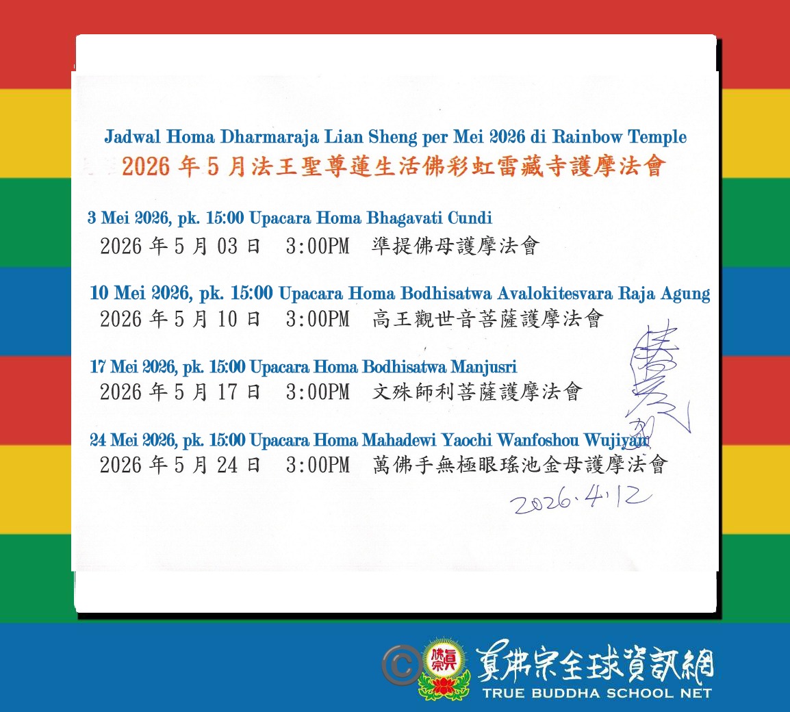 Jadwal Homa Dharmaraja Lian Sheng Bulan Mei 2026 di Rainbow Temple