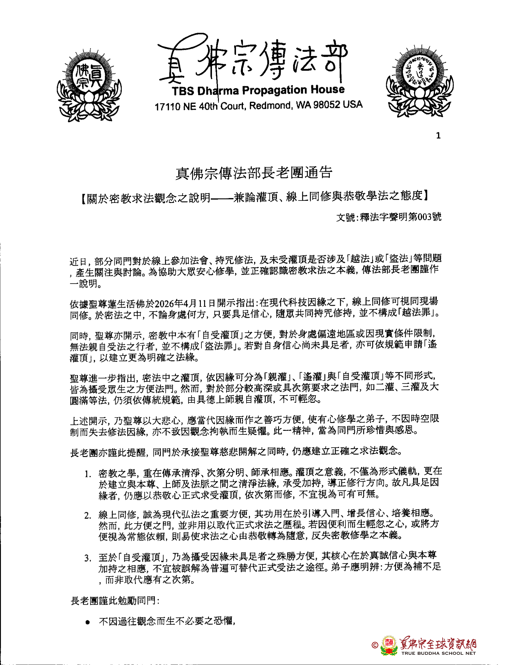 Dharmadesana di atas merupakan upaya dan kebijakan yang diberikan oleh Mulacarya Dharmaraja Lian Sheng dengan welas asih besar, menyesuaikan dengan sebab kondisi masa kini, agar para siswa yang sungguh ingin belajar Dharma tidak kehilangan kesempatan berbhavana karena keterbatasan ruang dan waktu, serta tidak menimbulkan keraguan dan ketakutan karena keterikatan pandangan. Semangat ini patut dihargai dan disyukuri oleh segenap siswa.
