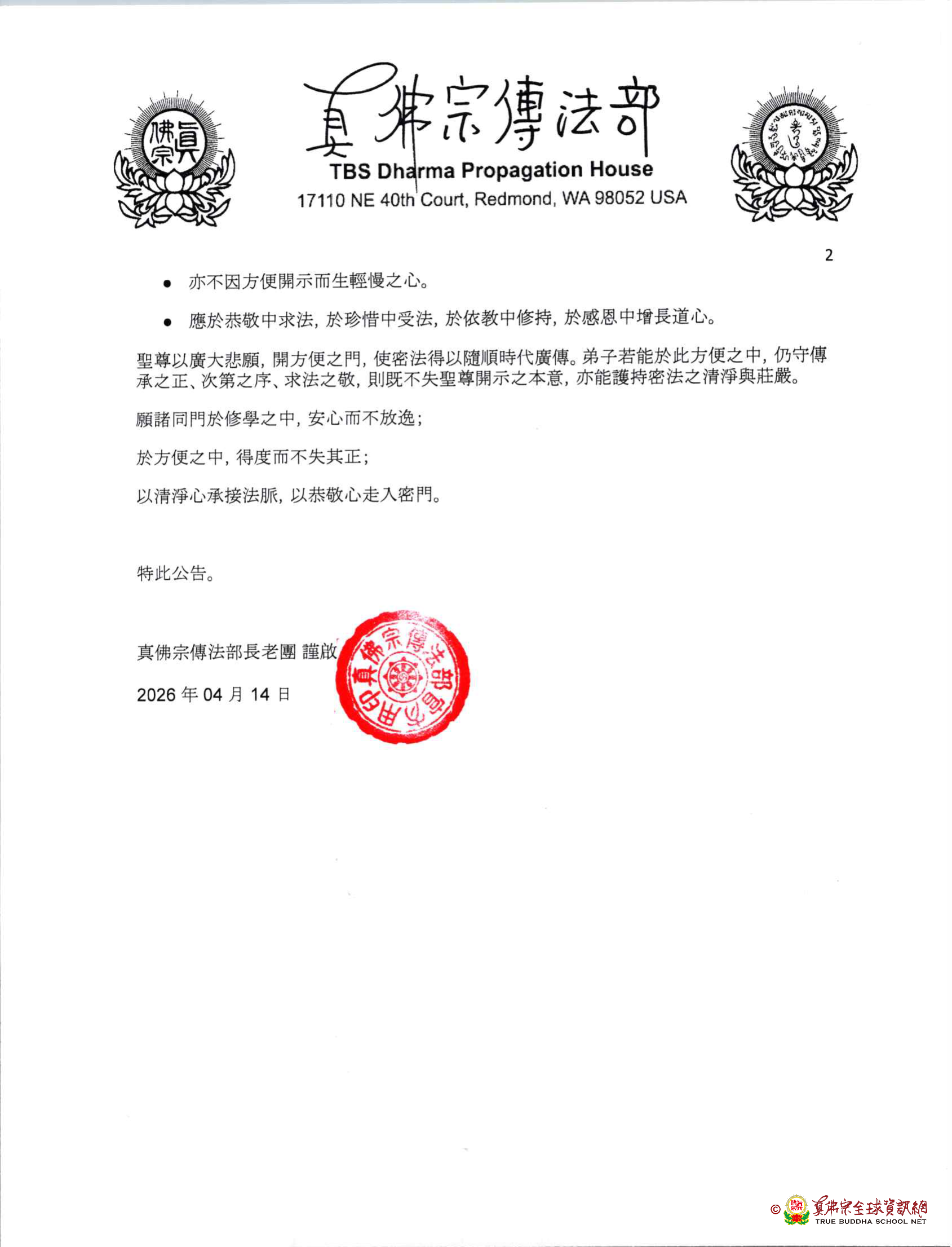 Dharmaraja Lian Sheng dengan tekad welas asih yang luas membuka pintu kemudahan, sehingga Sadhana Tantra dapat tersebar luas mengikuti zaman. Jika para siswa dalam kemudahan ini tetap menjaga kemurnian silsilah, urutan tahapan, dan sikap hormat dalam Mohon Dharma, maka tidak hanya tidak menyimpang dari maksud Dharmadesana Mahaguru, tetapi juga dapat melindungi kemurnian dan keagungan Sadhana Tantra.