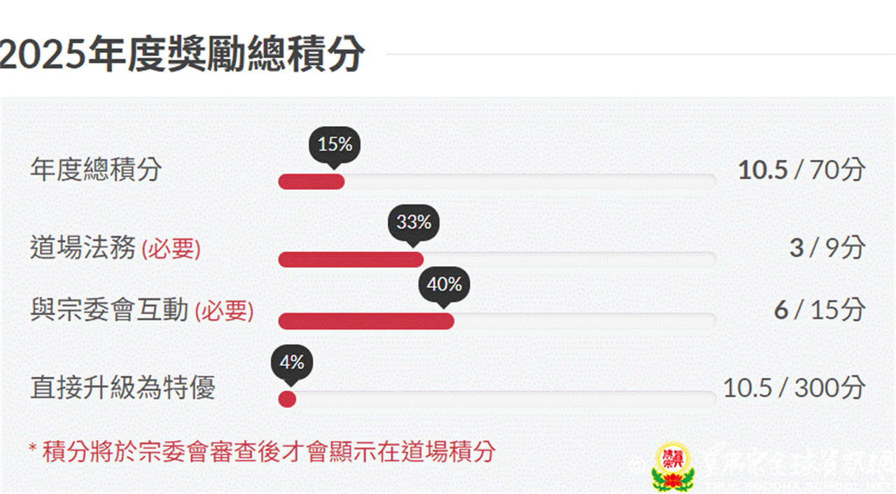 Seluruh kategori penilaian telah diumumkan secara lengkap di situs administratif Zhenfo Zong edisi regulasi 2025. “Interaksi komunitas, amal, panti jompo, pertukaran budaya” dinilai 0,5–3 poin per kegiatan. TBF akan merangkum “contoh pemberian poin aktual dari tahun-tahun sebelumnya” dan mempublikasikannya.