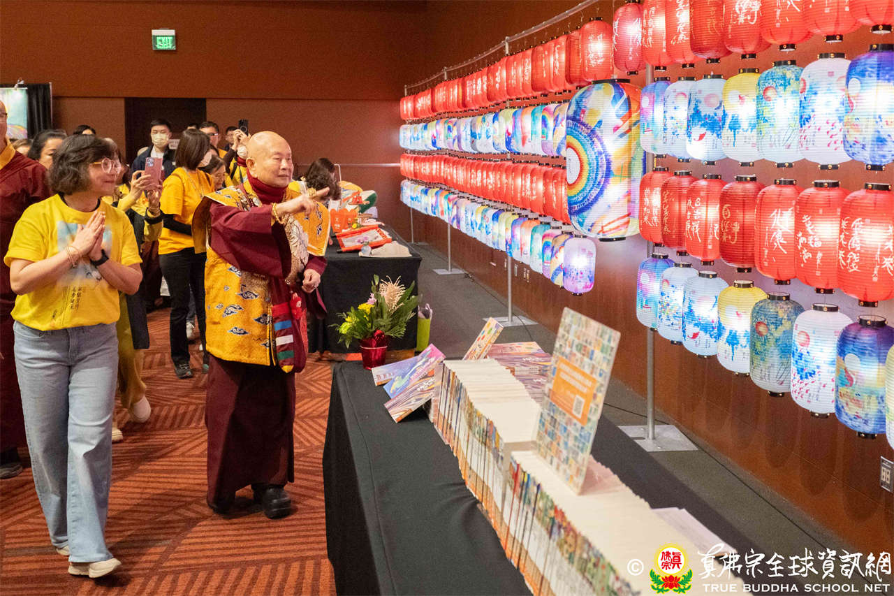 Dharmaraja Lian Sheng memasuki arena upacara, memberikan pemberkatan pada Triratna Mandala, altar penyeberangan, serta altar dirgahayu, kemudian meninjau dan mengadhisthana “Pameran Lukisan dan Kaligrafi Dharmaraja Lian Sheng” yang diselenggarakan oleh Tbboyeh. Pameran kali ini bertema “Dua Bangau Membawa Kemanggalaan Panjang Umur dan Kesehatan”, karya lukisan dan kaligrafi Dharmaraja Lian Sheng dirancang menjadi lentera-lentera indah, hampir 300 lampu doa dinyalakan di lokasi, setiap lampu melambangkan doa tulus para siswa agar Buddha tetap berdiam di dunia. Di sekelilingnya juga dipamerkan kumpulan karya tulis Mahaguru selama bertahun-tahun serta berbagai produk kreatif yang indah, memukau para pengunjung.