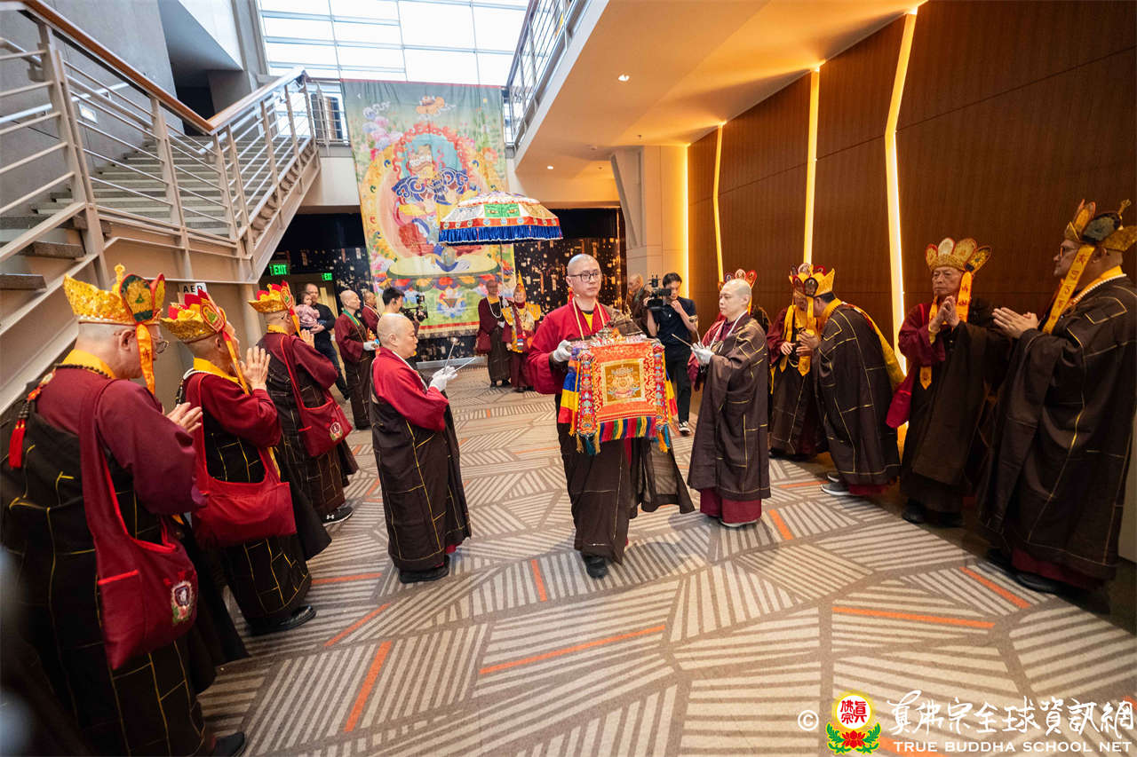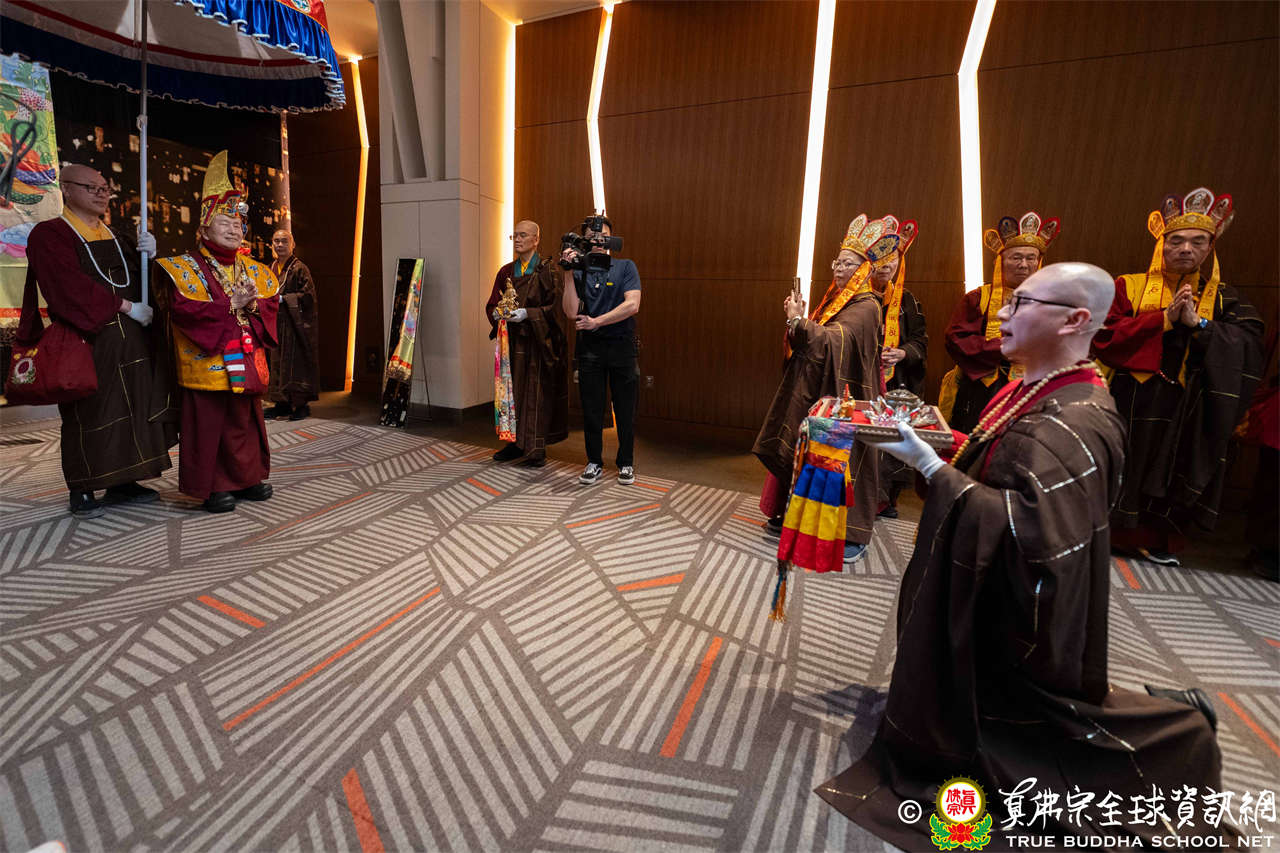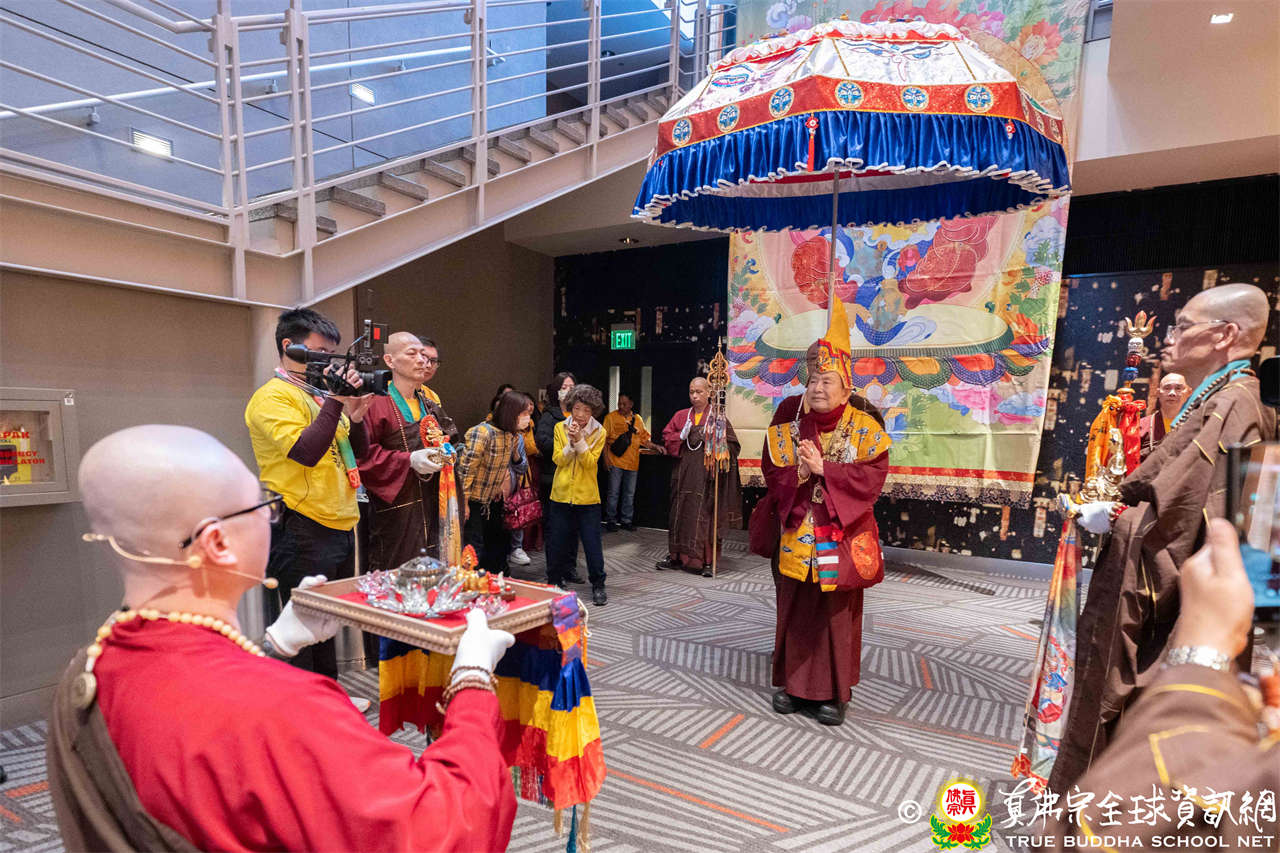 Tepat pukul dua siang, suara genta berbunyi, para siswa dari empat kelompok beranjali dengan khusyuk, bersama-sama melantunkan Mantra Hati Padmakumara, menyambut Mulacarya Silsilah Dharmaraja Lian Sheng memasuki mandala. Dharmaraja menggandeng cucunya Lu Yin berjalan memasuki lokasi, pemandangan yang hangat dan menyentuh. Mahaguru, para Ayushmat dan para Acarya memasuki altar, upacara resmi dimulai.