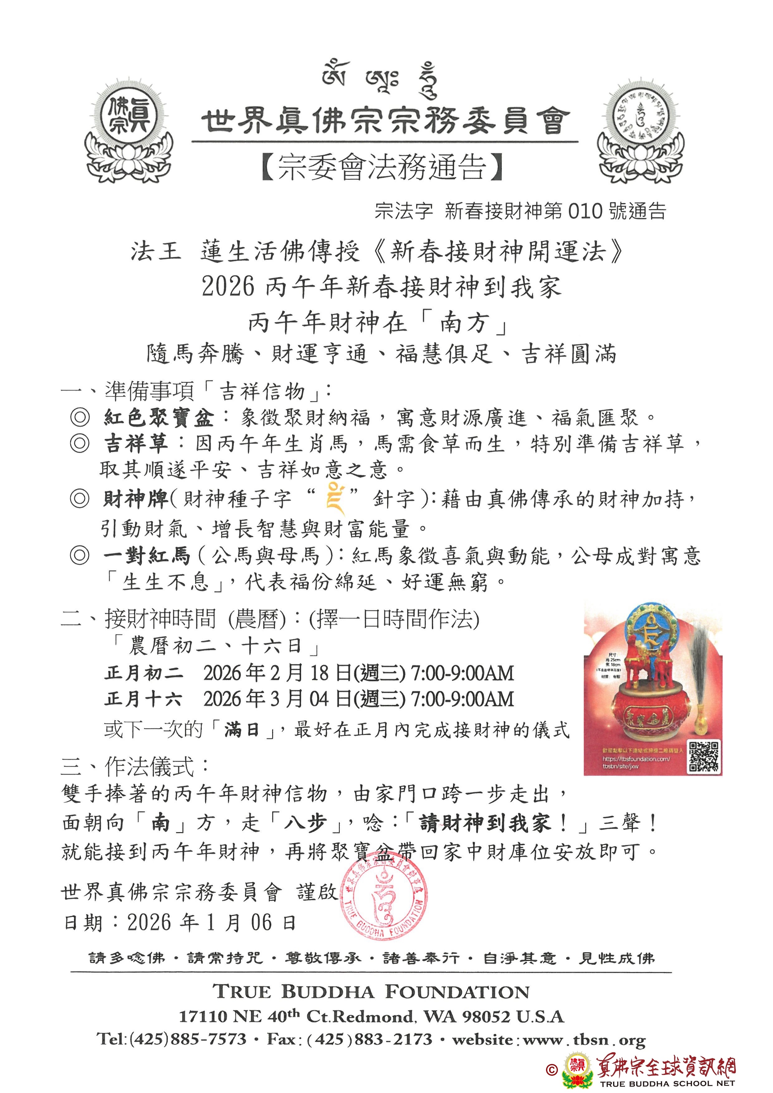 【Pemberitahuan Dharmabakti TBF】Dharmaraja Liansheng Mentransmisikan Sadhana Sambut Dewa Rezeki Tahun Bingwu 2026
