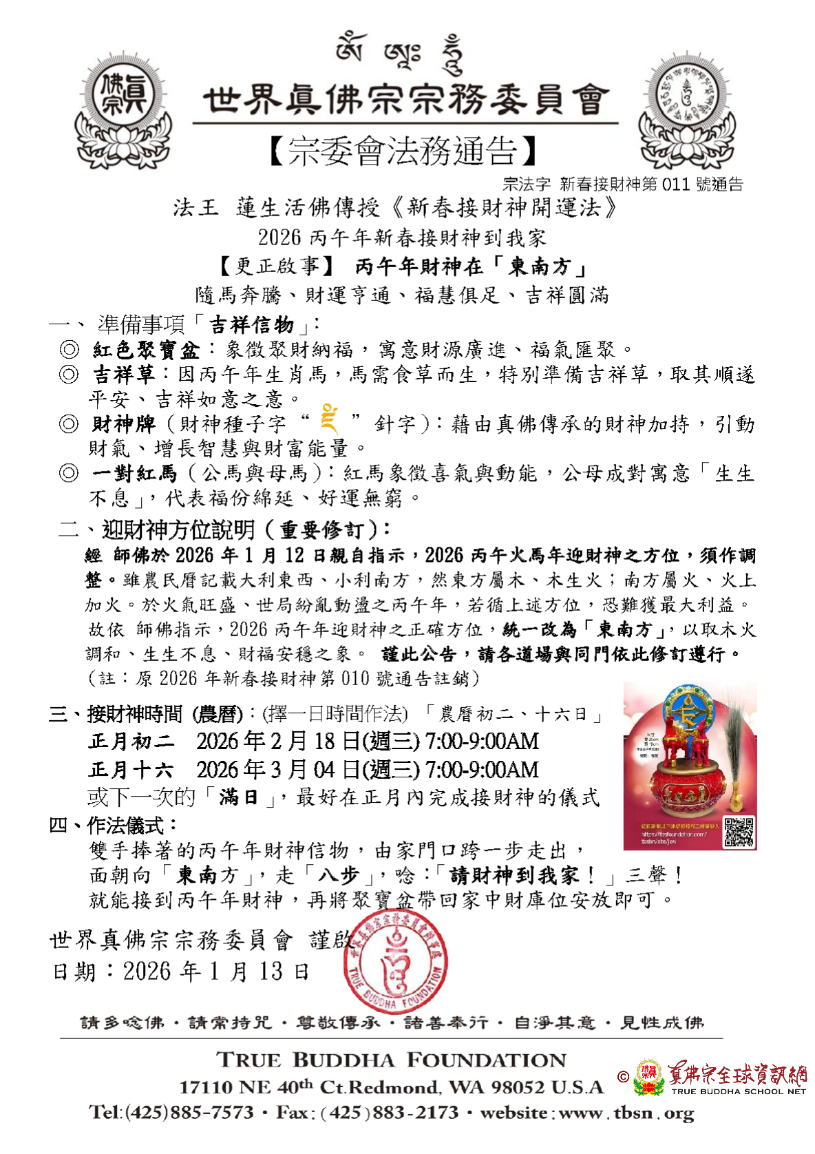 Oleh karena itu, Buddha Guru memberi petunjuk, arah yang tepat untuk sambut Dewa Rezeki di tahun Bingwu 2026, semua seragam diubah menjadi arah tenggara, menyelaraskan elemen kayu dan api, melambangkan berkah yang terus sinambung, rezeki dan ketenteraman. Oleh karena itu, TBF memberitahukan kepada seluruh tempat ibadah dan umat Sedharma, untuk mengikuti revisi ini.