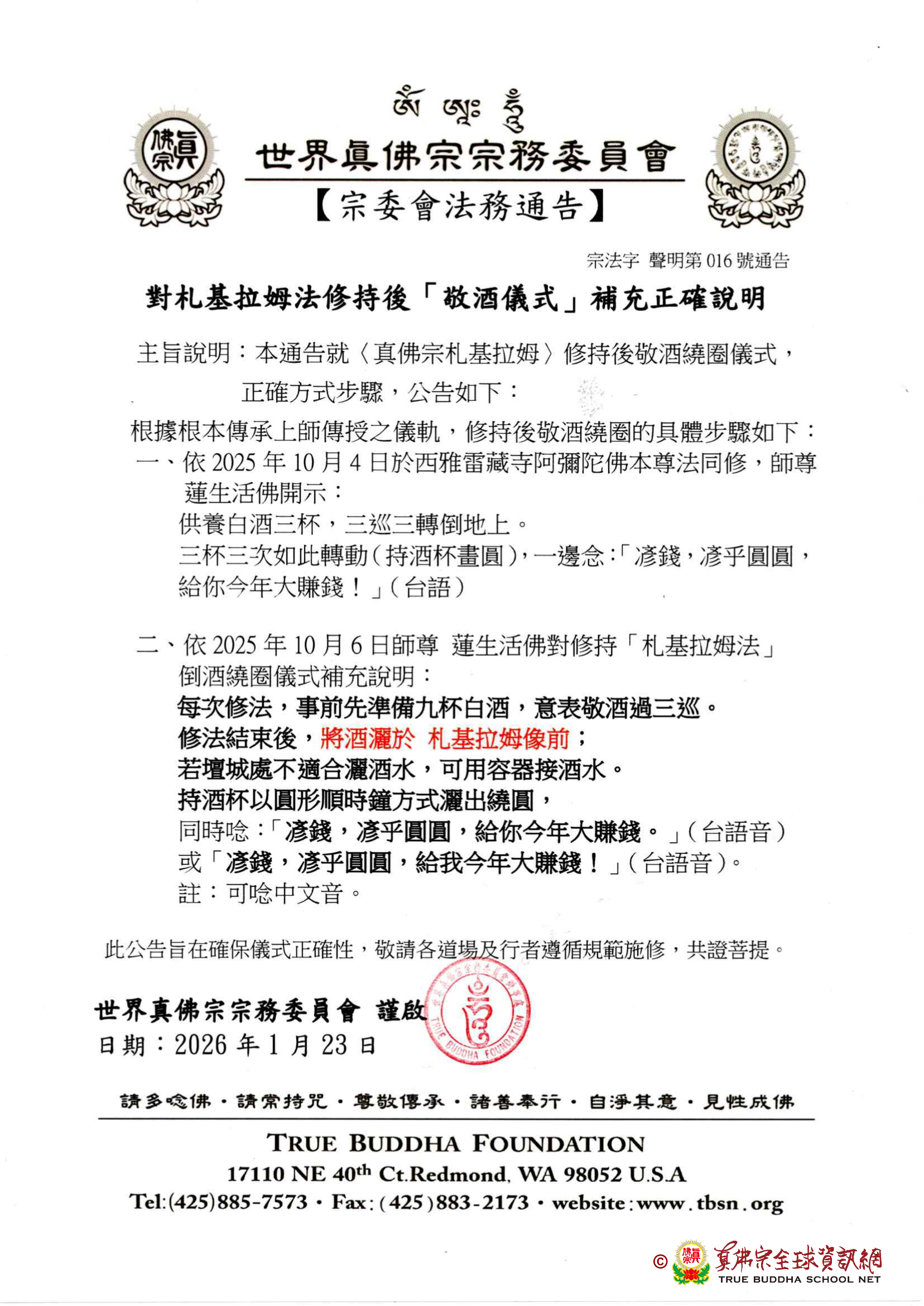 Pemberitahuan ini bertujuan untuk mengumumkan cara dan langkah yang benar dari ritual persembahan arak dengan gerakan melingkar setelah pelaksanaan Sadhana Zhenfo Zong Drashi Lhamo, sebagai berikut: