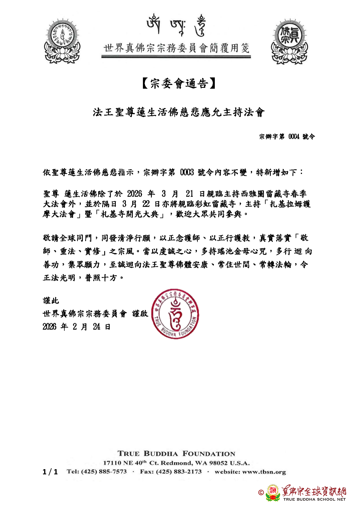 Dharmaraja Lian Sheng selain pada tanggal 21 Maret 2026 secara pribadi hadir memimpin Upacara Agung Musim Semi di Seattle Ling Shen Ching Tze Temple, juga pada keesokan harinya tanggal 22 Maret akan secara pribadi hadir di Rainbow Temple, memimpin “Upacara Agung Homa Drashi Lhamo” sekaligus “Upacara Agung Abhiseka Zashi Temple”, mengajak Anda semua untuk bersama-sama berpartisipasi.